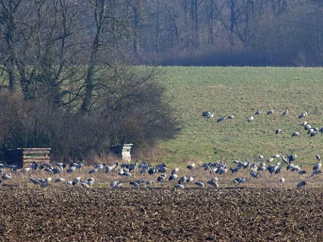 Doté d’un observatoire pour être à l’abri, vous pourrez voir à perte de vue toute l’étendue du lac où se reposent les Grues cendrées avant le lever du jour. Ce site est le plus fréquenté car il permet d’assister à ce spectacle naturel où la majorité de ces grands volatiles décollent et passent au-dessus. Et pour les plus férus de photographie, le soleil se lève en face, permettant d’obtenir de très beaux clichés.