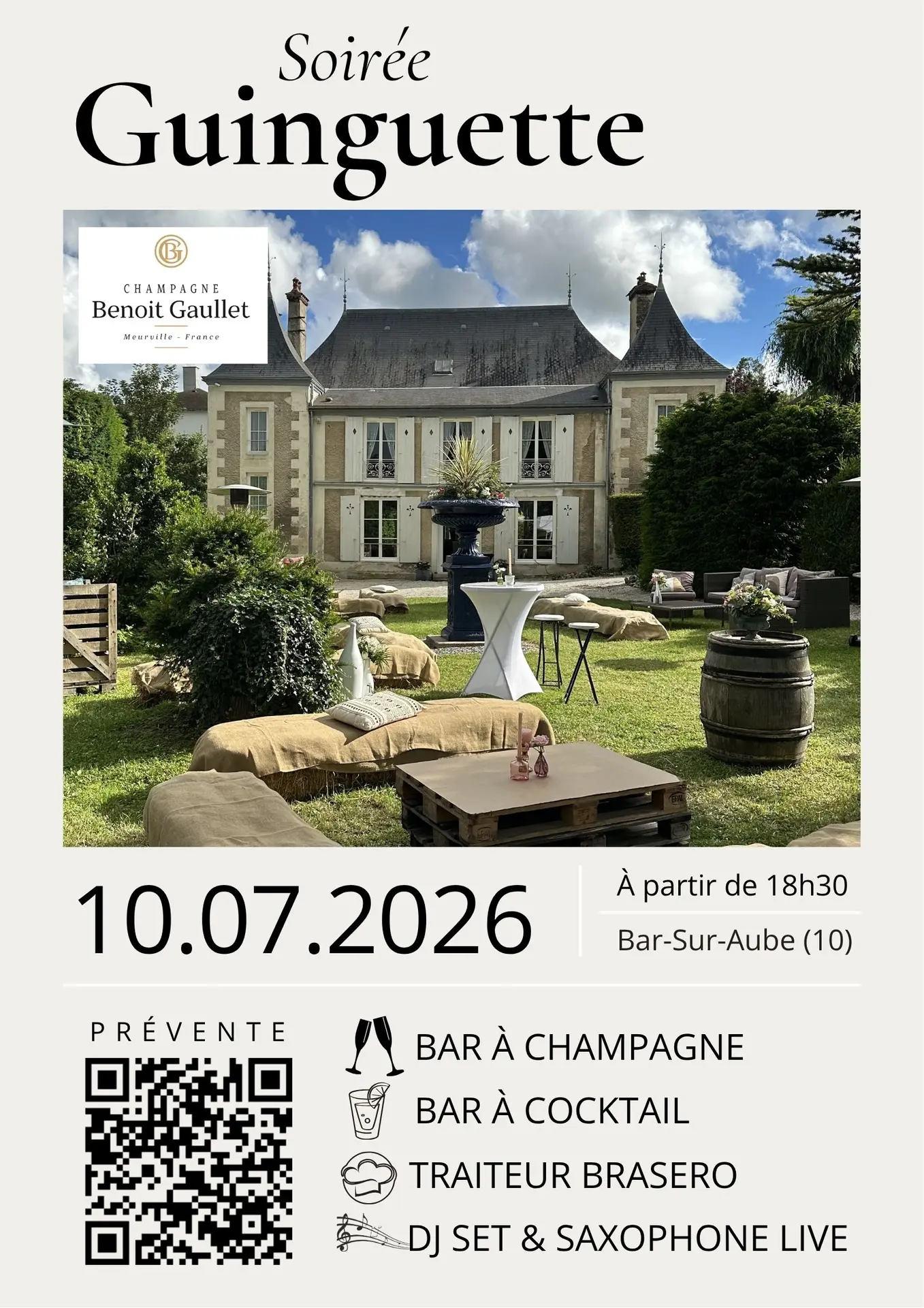 Au programme : DJ saxophoniste Jack Cino, traiteur Brasero, atelier cocktail et champagne. Une soirée dansante comme on les aime, sous les beaux soirs d'été.